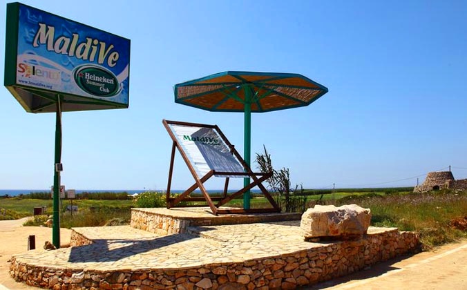 Questo tratto di costa viene proprio definito Maldive del Salento. Prende il nome da uno dei primi stabilimenti balneari in loco nato nel 2000. Lo stabilimento è caratterizzato da un’insegna formata da un’enorme sdraio alta oltre quattro metri con il relativo ombrellone alto quasi cinque metri e posizionato lungo il ciglio della provinciale, qui una foto è d’obbligo.